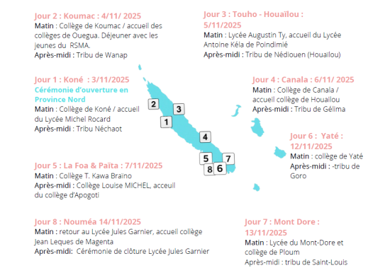 La caravane de l’entrepreneuriat est une initiative itinérante portée par le lycée Jules Garnier de Nouméa et soutenue par le vice-rectorat de la Nouvelle-Calédonie. Elle sillonnera le territoire du 3 au 14 novembre 2025 (Koné, Koumac,Touho, Houïlou, Canala, La Foa, Païta, Mont Dore, Yaté, Plum, Nouméa) pour parler d’entrepreneuriat dans les collèges, lycées et tribus afin de porter un message fort aux jeunes calédoniens de 12 à 25 ans :