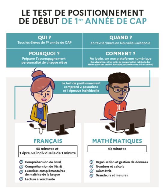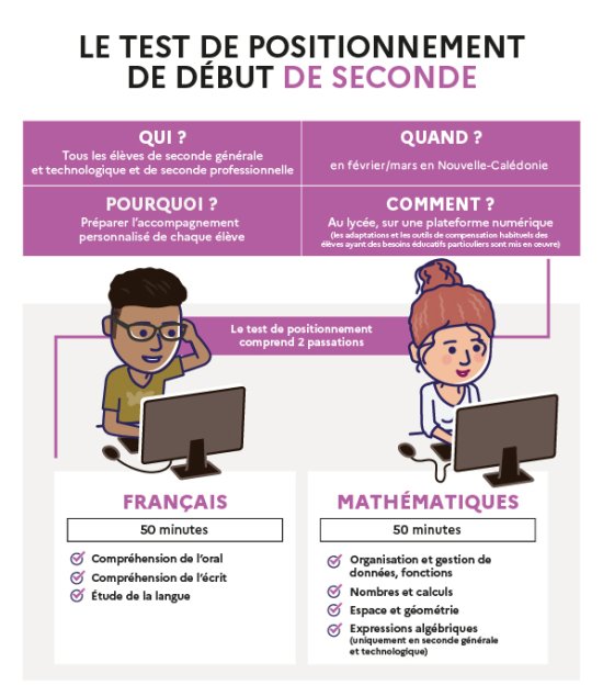 En début d’année, chaque élève de seconde générale et technologique ou professionnelle et de première année de CAP passe un test de positionnement qui lui permet d’identifier ses acquis et ses besoins en maîtrise de la langue française et en mathématiques. Ce test doit aider les enseignants à mieux cibler et organiser cet accompagnement.